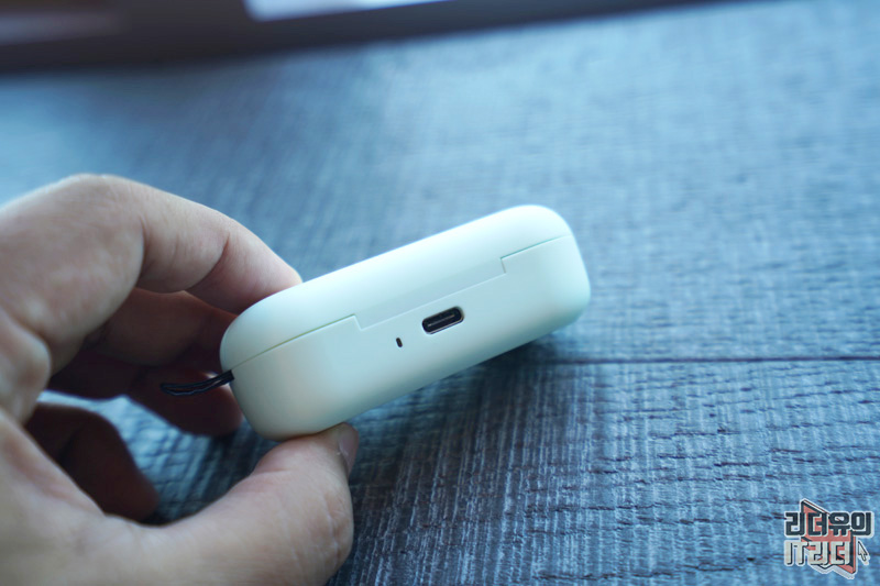 뒷부분에는 USB-Type C의 충전단자가 있고 옆에 LED 상태 표시 램프가 있습니다. 이어폰을 장착했을 때나 충전을 할 때나 램프로 확인해 볼 수 있습니다. 참고로 사용시간은 완충 시 최대 5.5 시간 사용 가능하고 노이즈캔슬링 기능 활성화시에는 5시간 사용 가능합니다. 그리고 충전 케이스를 이용했을때는 최대 25시간 사용 가능하고 노이즈캔슬링 기능으로만 사용할 시에는 22시간 재생 가능합니다.