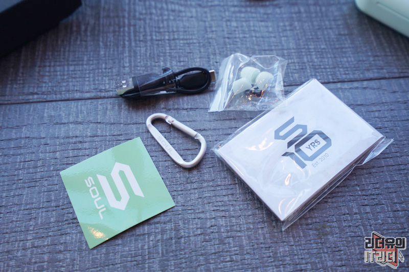 소울 SYNC ANC 구성품은 이어팁, USB TYPE-C 케이블, SOUL 카라비너가 제공됩니다. 보통의 무선이어폰에서는 볼 수 없는 카라비너가 제공되는 것이 인상적입니다.