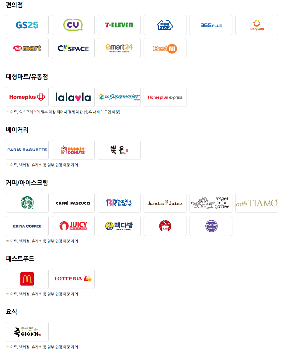 그리고 대형마트도 가능합니다. 홈플러스, GS 슈퍼마켓에서는 이용이 가능합니다. 다만 사람들이 많이 찾는 이마트, 롯데마트는 지원하지 않는 점이 아쉬운 부분입니다.