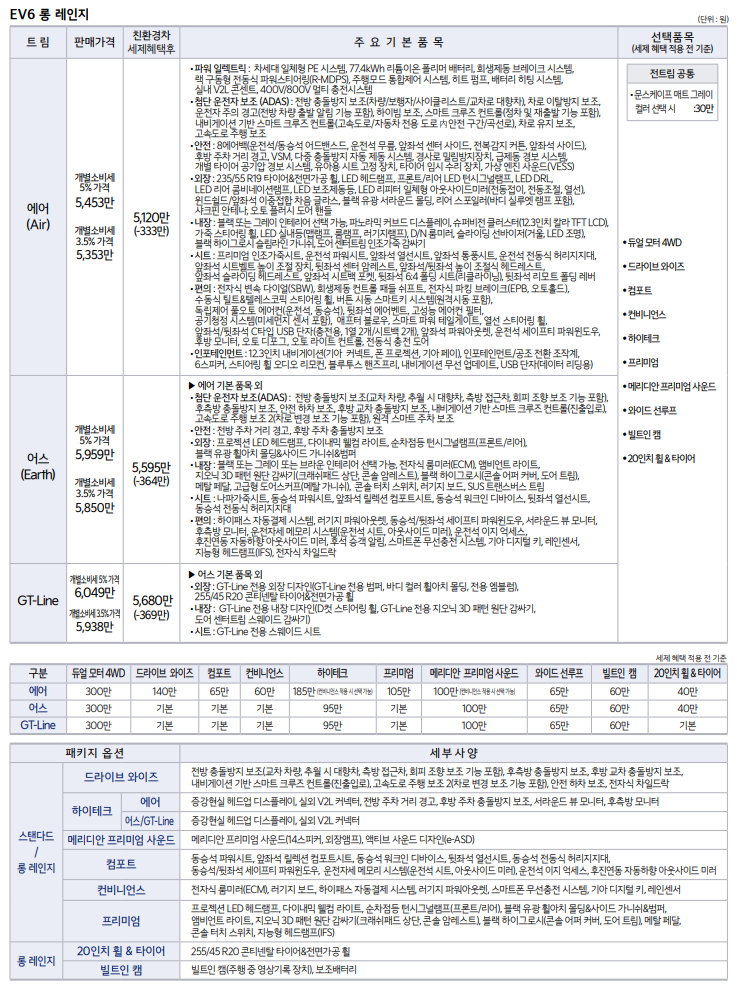 하지만 위에서도 언급했듯이 기아 EV6 스탠다다는 주행거리가 많이 짧습니다. 그래서 그리 추천하는 모델은 아니고 구입하려면 무조건 기아 EV6 롱레인지로 가는게 좋습니다. 기아 EV6 롱레인지 가격은 개별 소비세 5% 기준 5,453만원 부터 시작합니다. 롱레인지 모델도 마찬가지로 어스 모델에 매력적인 기능이 대거 들어가 있습니다. 첨단 운전자 보조, 안전, 외장, 내앚, 시트, 편의 기능을 보면 무조건 기아 EV6 롱레인지 어스로 가셔야 할 것 같습니다. 가격은 5,959만원 입니다. 그런데 여기에 추가 옵션을 더 하면 가격은 6,000원을 넘어갑니다.