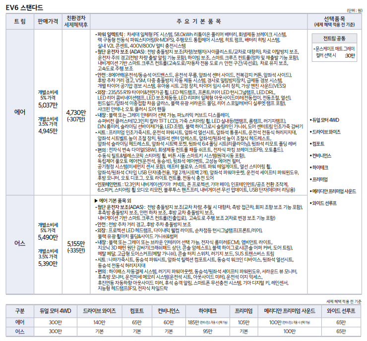 기아 EV6 스탠다드 가격은 기본 개별소비세 5% 기준 5,037만원 부터 시작합니다. 에어와 어스 트림으로 구분되어 있고 첨단 운전자 보조, 안전, 외장, 내장, 시트, 편의 기능까지 제대로된 사용을 하려면 기아 EV6 스탠다드 어스 모델로 가는게 합리적입니다.
