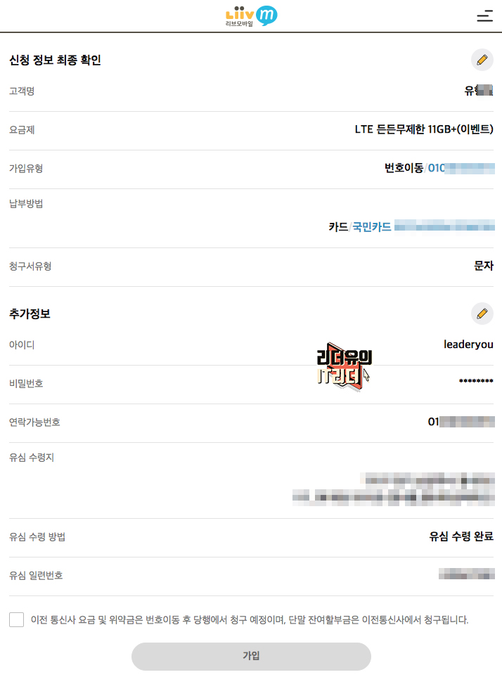 이렇게 해서 KB 리브모바일 무제한 요금제 가입을 완료했습니다. 기존에 통신비가 6만원 이상이 나왔는데 통신 요금이 거의 3배 가까이 줄었습니다. 이제 남는 금액으로 치킨을 사먹어야 될 것 같습니다.