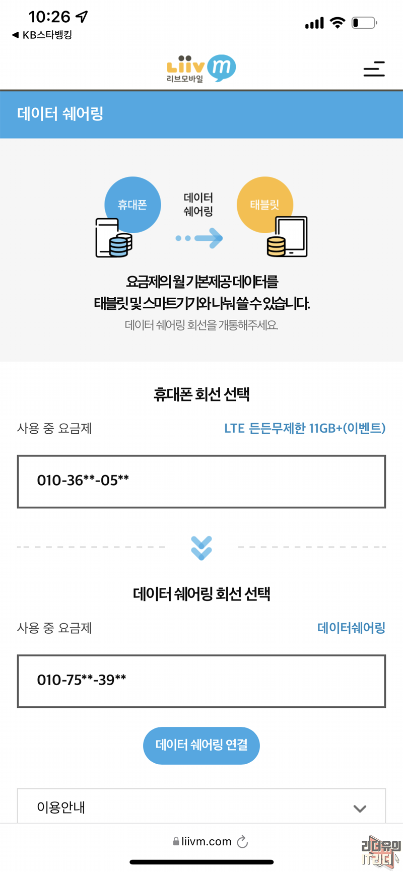 KB 리브모바일에서 데이터 쉐어링 연결을 해주니 이제 독립적으로 사용이 가능합니다. 대박입니다.