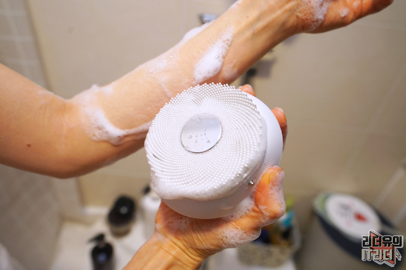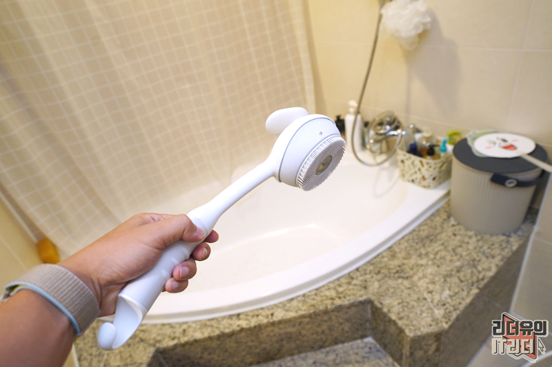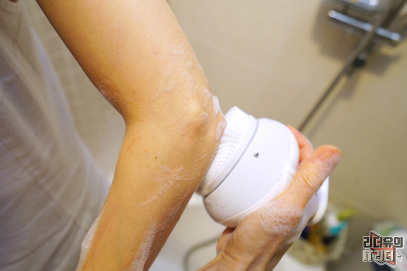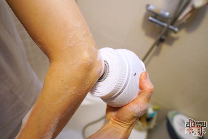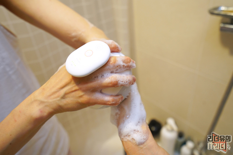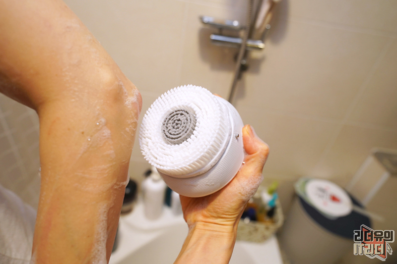 데일리 초음파 샤워 브러시를 사용하는 모습입니다. 부드러운 실리콘 재질이라 피부에 부담없이 사용하기 좋습니다. 당연히 손으로 하는 것보다 훨씬 편하고 좋겠죠. 초음파 진동으로 피부속까지 세척을 할 수 있게 해주니 샤워할 때 더욱 개운하고 좋습니다.