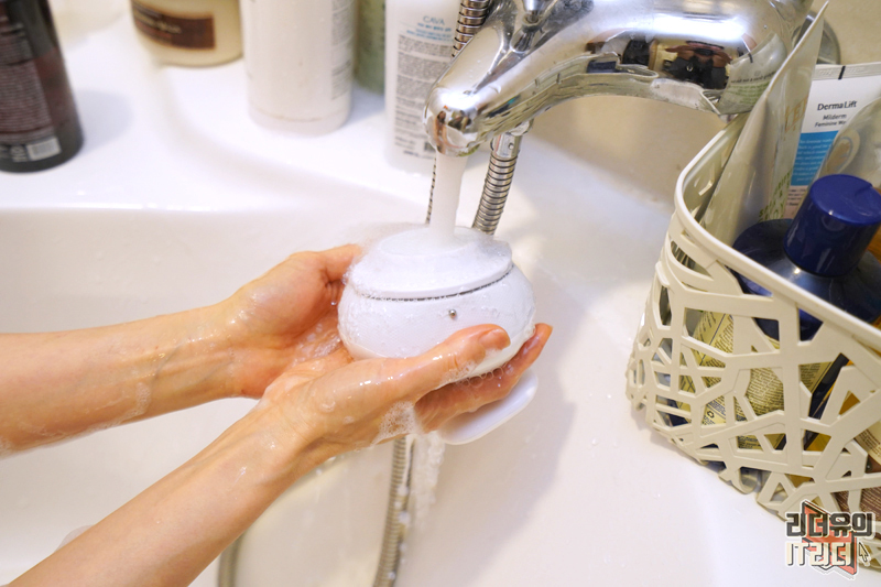IPX7 방수를 지원해 이렇게 흐르는 물로 세척도 가능하고 사우나, 목욕탕에서도 사용이 가능합니다. 거치대에 올려두면 건조가 되는 효과도 있습니다. 그리고 초음파 헤드는 물이 닿아도 녹슬지 않는 내구성 강한 SUS316L 소재를 사용했습니다.