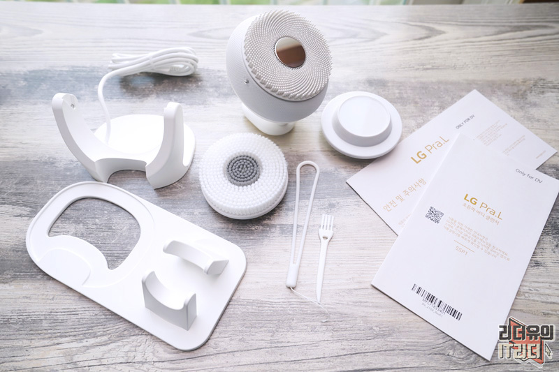 LG 프라엘 바디스파 구성품은 본체, 바디 각 부위별 특화된 브러시 3종, 욕실 거치 및 이동이 가능한 브러시 거치대, 충전을 위한 USB 연결 거치대, 손목 스트랩, 브러시용 청소솔, 사용설명서로 구성되어 있습니다.