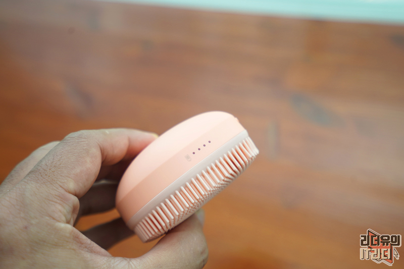 옆에서 본 모습입니다. 아래에는 실리콘 브러시가 있고 그 윗부분은 손에 파지할 수 있는 영역입니다.