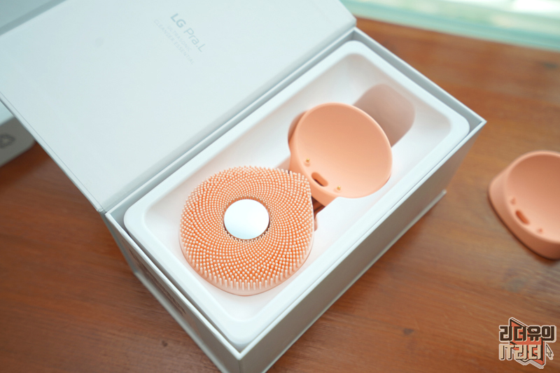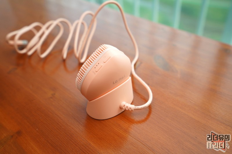 패키지를 오픈하면 핑크빛의 LG 프라엘 워시팝을 볼 수 있습니다. 워시팝은 두 가지 색상으로 피치팝과 코코팝가 있는데요. 이 모델은 피치팝 색상입니다. 충전 거치대까지 같은 색을 적용해 일체감 있는 디자인을 보여주고 있습니다. 참고로 모델명은 BCP1 입니다.