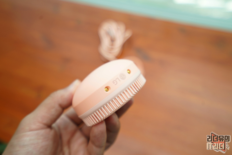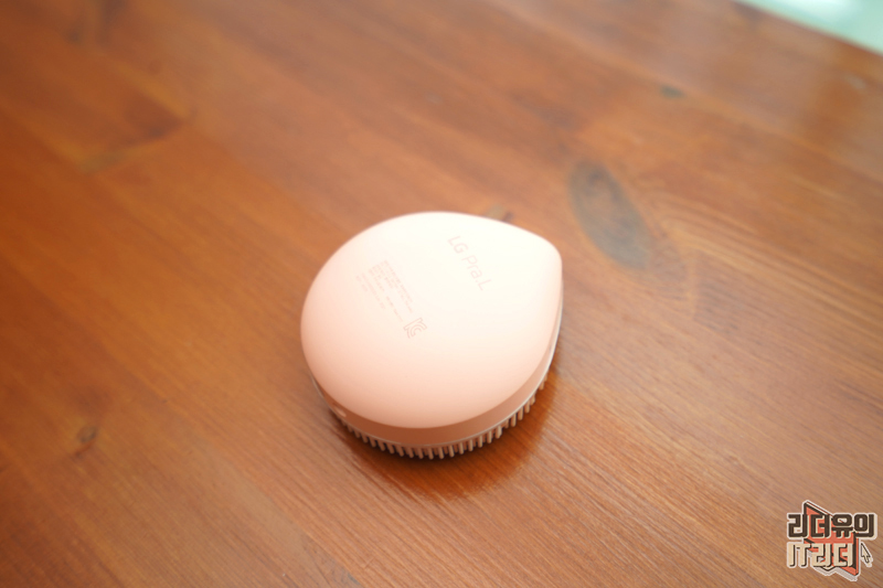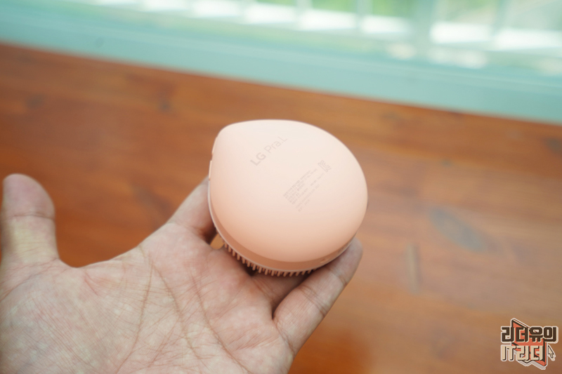 LG 프라엘 워시팝은 물방울 모양을 하고 있습니다. 복숭아 같기도 한 디자인으로 한 손에 쏙 들어가는 디자인을 가지고 있습니다. 볼록하게 입체감 있는 디자인과 보들보들한 재질이라 잡았을때 안정된 그립감을 느낄 수 있습니다.