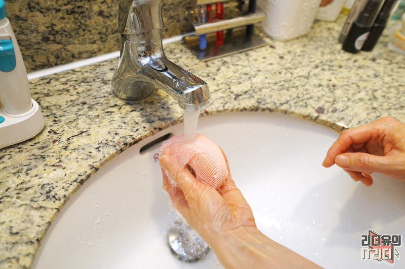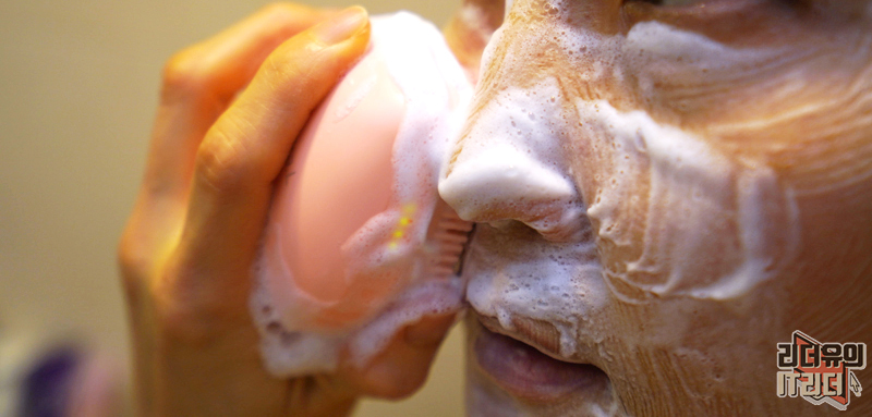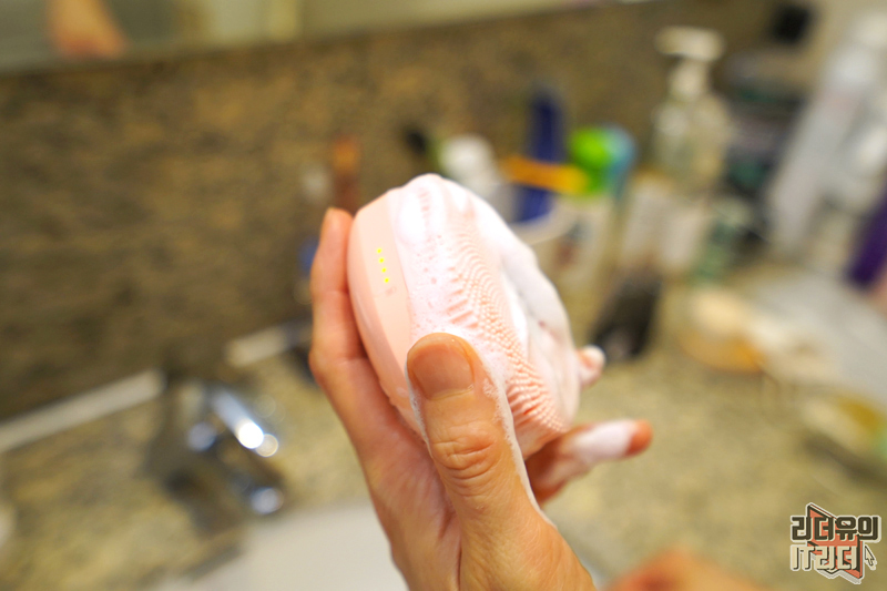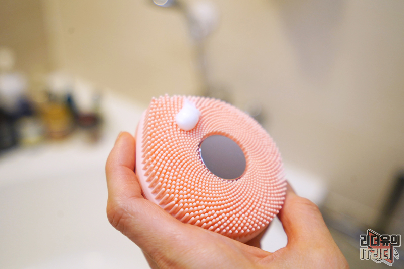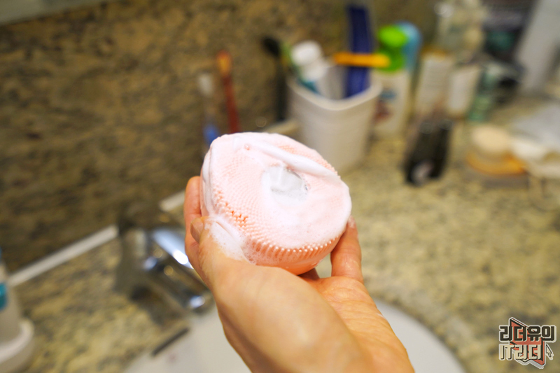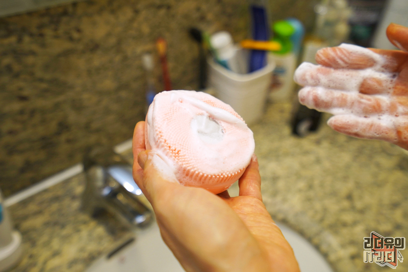 얼굴에 클렌징을 하는 모습입니다. 손에 착 감기는 디자인이라 확실히 편하고 자극 없는 실리콘 재질의 브러시라 피부를 케어하기에 최적화 되어 있습니다.