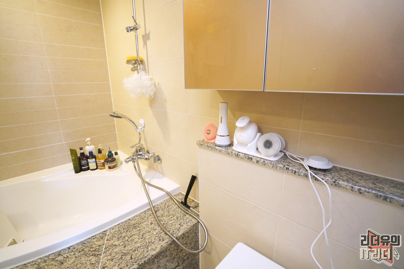 매일 사용하는 욕조 옆에 두고 사용하는 모습입니다. 샤워하면서 가볍게 세안을 할 수 있으니 너무나 편하고 좋습니다. 손으로 세안하는 것과 LG 프라엘 워시팝으로 세안하는 것은 확실히 다른 매력을 느낄 수 있습니다.