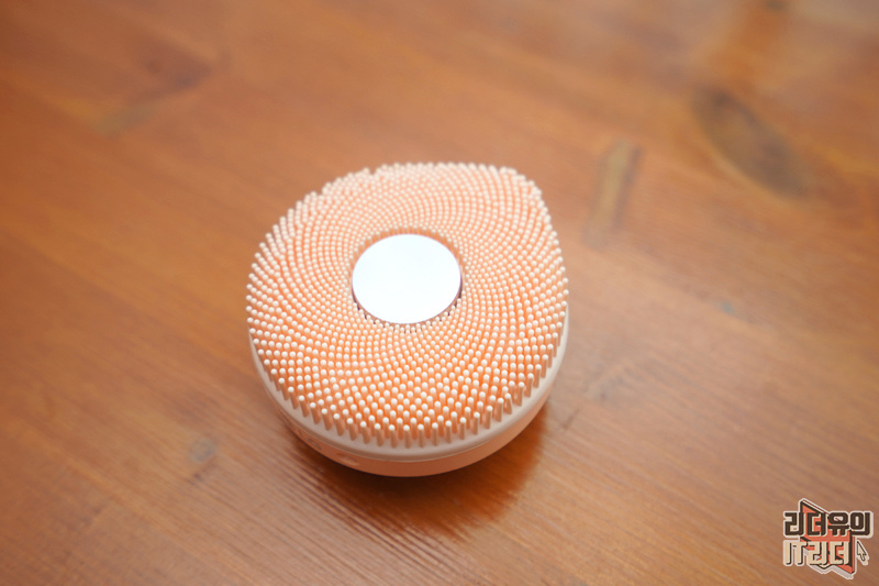 바닥면을 보면 가운데 메탈 부분이 초음파 영역이고 실리콘 브러시가 둘러져 있습니다. 미세한 초음파 진동으로 모공 속까지 깨끗한 케어를 할 수 있도록 해주고 부드러운 실리콘 브러시로 피부 자극 없이 세안을 해주는 구조입니다. 실리콘 돌기가 피부를 더 넓고 섬세하게 감싸도록 회오리 모양의 특허 받은 피보나치 패턴이 적용되어 있습니다.