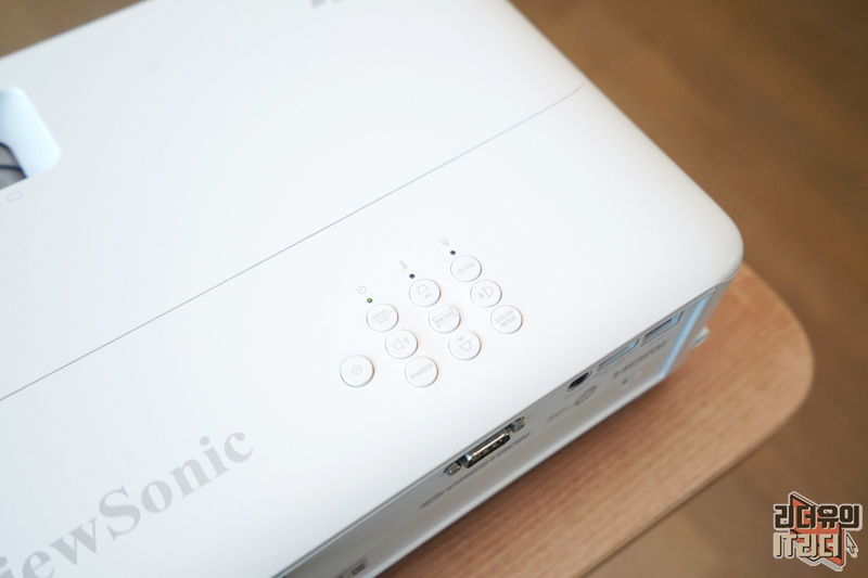 아래쪽으로 내려오면 빔프로젝터 본체에서 바로 컨트롤 할 수 있는 기능 버튼들이 있습니다. 키스톤 조정 버튼, 블랭크 버튼, 소스 버튼, 컬러 모드 버튼으로 직관적인 컨트롤이 가능해서 좋습니다.