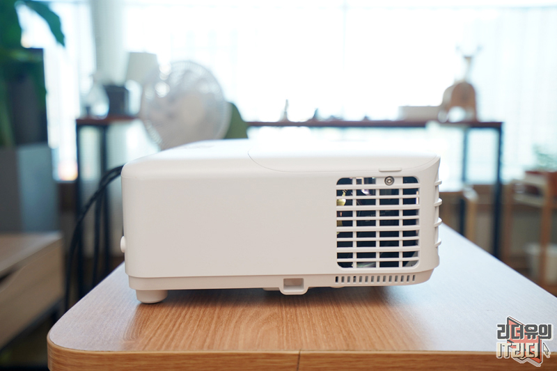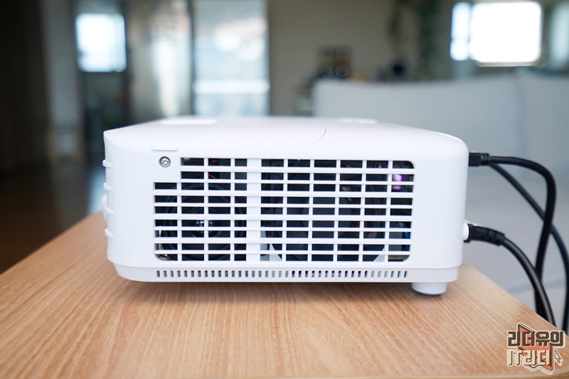 옆면에는 열을 효과적으로 배출하기 위한 방열 시스템이 잘 갖춰져 있습니다. 빔프로젝터는 열이 많이 발생하는 제품이라 열관리가 중요한데요. 제가 장시간 사용해 봤는데 열이 많이 뜨겁지도 않고 팬 소리도 심하지 않아서 좋았습니다. 물론 소리가 아예 안나는 수준은 아닙니다. 제가 영상으로 기록해 놨으니 참고하세요.