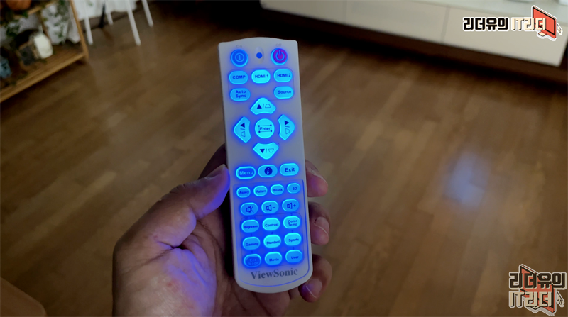 리모컨은 백라이트 기능을 지원합니다. 빔프로젝터는 아무래도 어두운 공간에서 사용하는 경우들이 많은데요. 그런걸 고려해 버튼을 조작하면 백라이트가 들어와 쉽게 사용할 수 있게 했습니다.