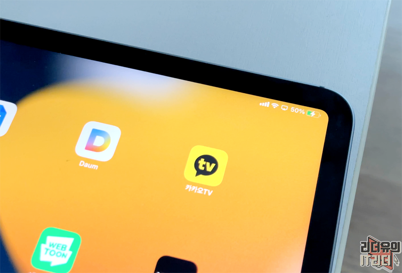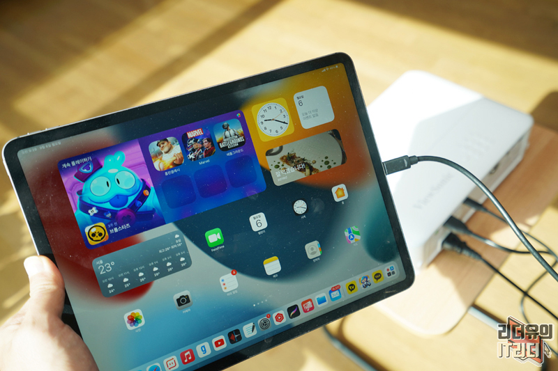 충전 표시가 뜬거 보이시죠? 단순히 기기를 연결하는데 그치면 배터리 부족 현상 때문에 컨텐츠 이용에 제약이 따르는데요. 충전 걱정없이 사용할 수 있기 때문에 모바일 디바이스와의 조합이 정말 좋습니다.