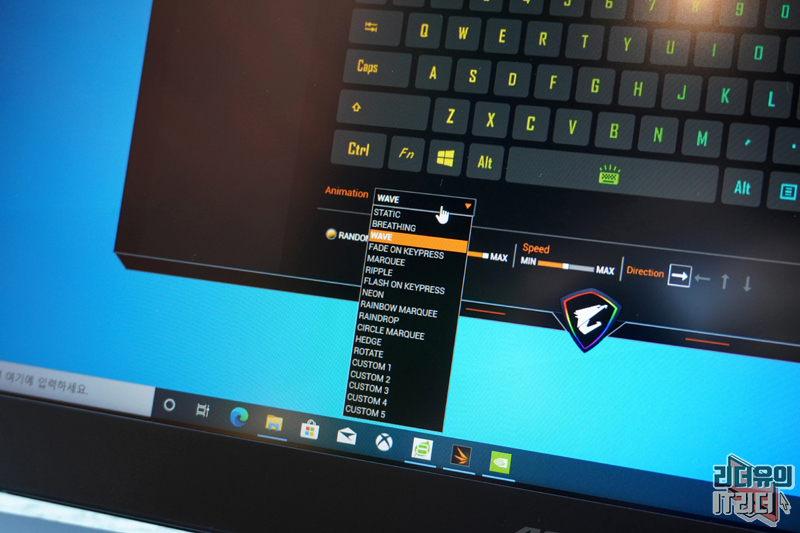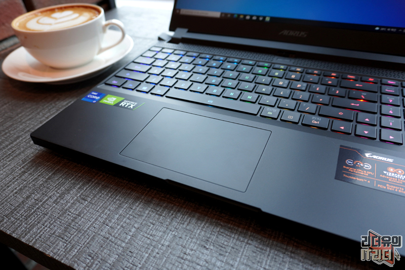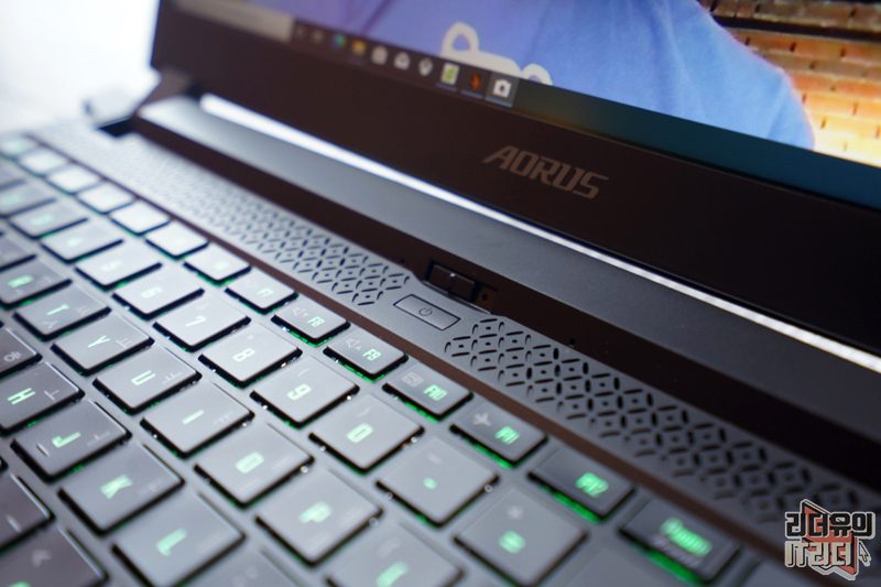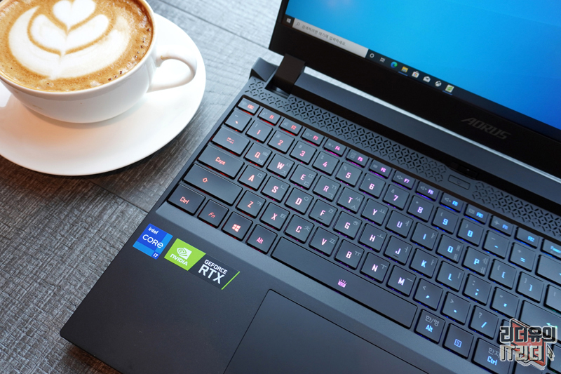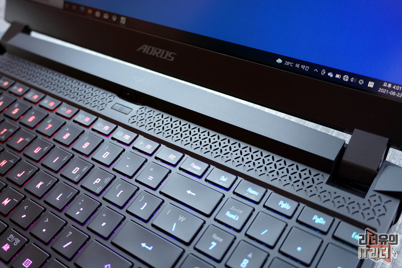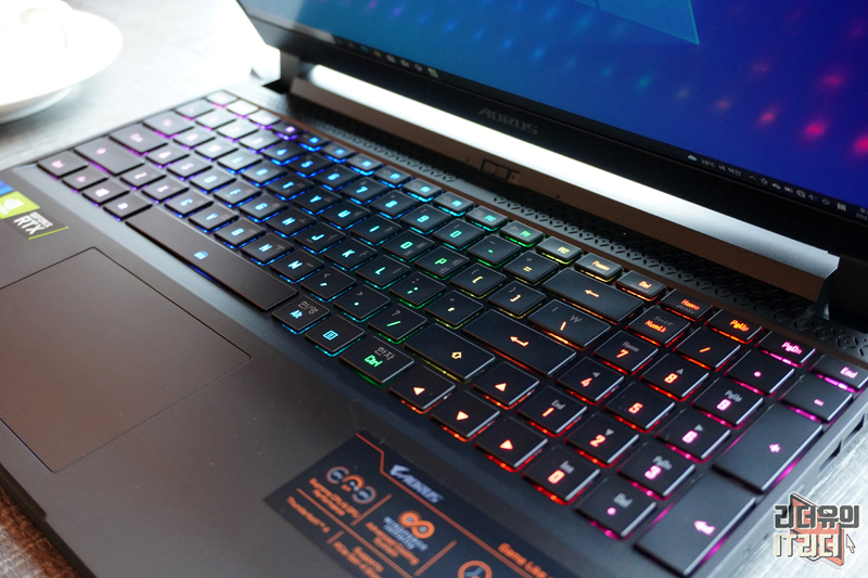 키보드 영역은 게이밍 노트북의 화려함을 보여주고 있습니다. 기가바이트가 가장 잘하는 부분 중에 하나인데요. 사용자가 조작 가능한 라이팅 시스템을 적용해 언제 봐도 예쁜 키보드 영역을 느낄 수 있습니다. 이 부분은 아래에서 더욱 자세하게 보여드리도록 하겠습니다.