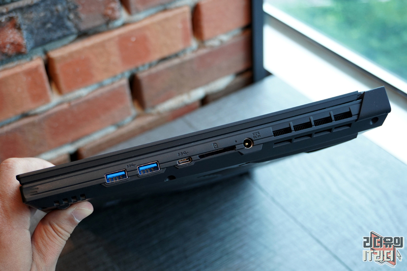 기가바이트 어로스 15P XD 오른쪽면에는 USB 3.2 (gen.1) x 2, 썬더볼트4, UHS-II SD 카드 리더, 전원 잭이 있습니다.