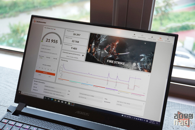 전체적인 PC 그래픽 성능을 보여주는 3DMARK 점수는 21,955점이 나왔습니다. 노트북에서 이 정도 점수가 나온다니 정말 놀랍다 할 수 있습니다. 참고로 일반적인 슬림한 노트북의 점수를 보면 3,000점대 이하로 나옵니다.