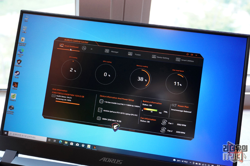기가바이트 어로스 15P XD는 노트북 사용을 보다 쉽게 할 수 있도록 전용 어로스 컨트롤 센터 앱을 제공하고 있습니다. Smart Dashboard에서는 현재 시스템 상황을 한 눈에 볼 수 있게 제공하고 있습니다. CPU, GPU, 메모리, 저장공간을 보여주는 표시입니다.