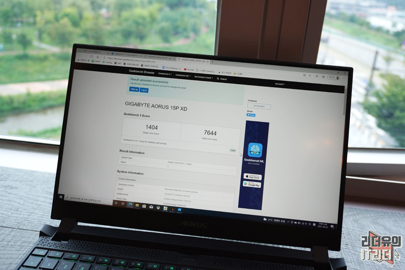 기가바이트 어로스 15P XD 긱벤치5 점수는 싱글코어 1404점, 멀티코어 7644점이 나왔습니다. 멀티코어 성능 점수가 상당히 높게 나온 것을 알 수 있습니다.