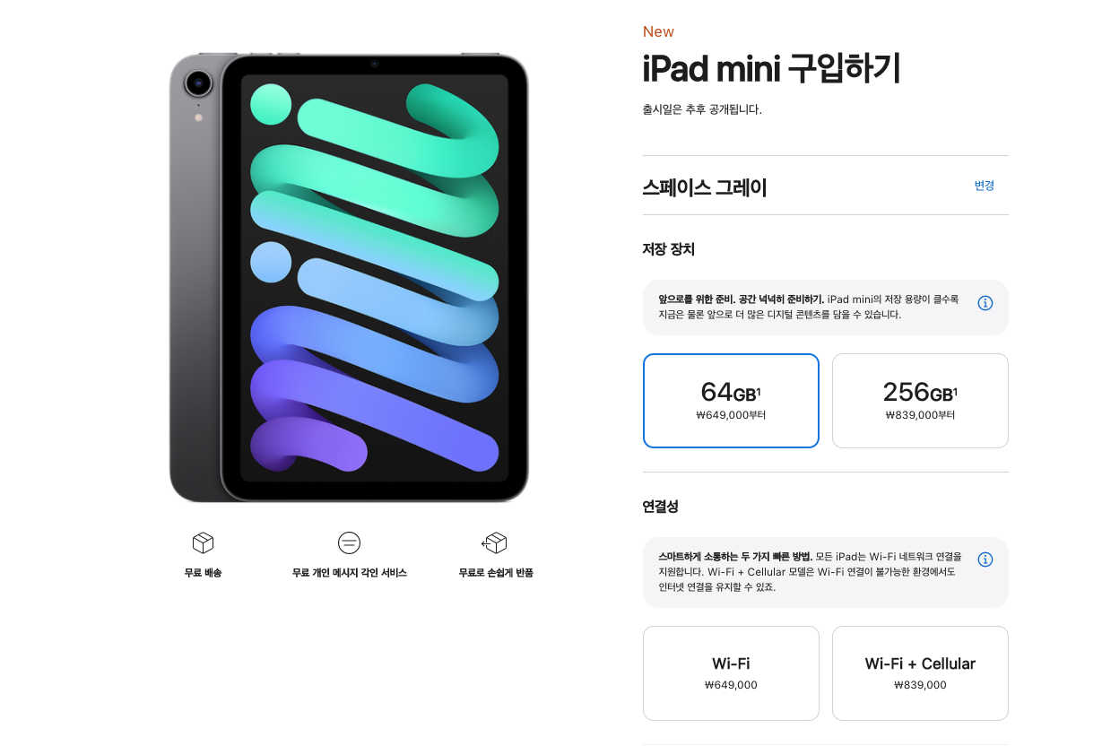 아이패드 미니 6세대는 64GB 모델과 256GB 모델이 있습니다. 64GB 가격은 649,000원, 256GB 가격은 839,000원 입니다. 셀룰러 모델은 64GB 839,000원, 256GB 1,029,000원 입니다.
