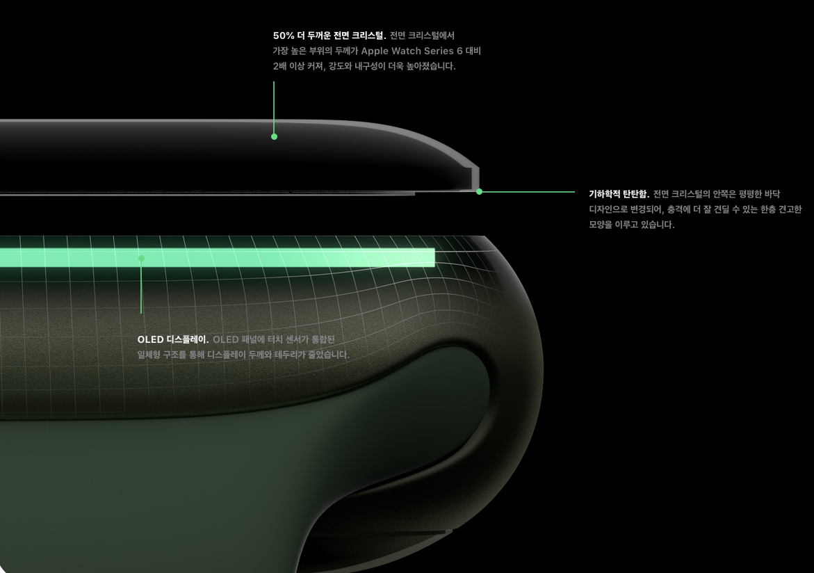 애플워치 시리즈7은 내구성의 변화도 있습니다. 전면 디스플레이를 충격과 균열에 강한 크리스털을 탑재했습니다. 고가의 시계에서 적용되는 디스플레이라 더욱 안심하고 사용할 수 있는 변화입니다.