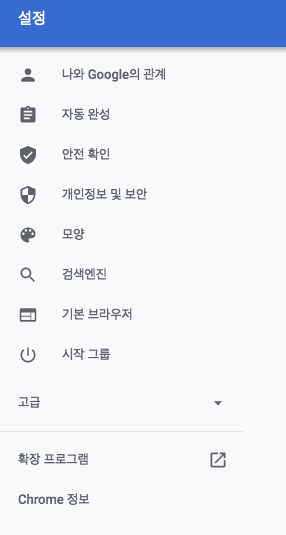 왼쪽 메뉴를 보면 아래쪽에 확장 프로그램이라고 있습니다. 구글 크롬 브라우저는 여러가지 프로그램을 설치해 다양한 기능을 할 수 있는데요. 하지만 이것저것 설치하다 보면 구글 크롬 브라우저가 무거워지게 됩니다. 그래서 안쓰는 것이 있다면 삭제를 하시면 좋습니다.
