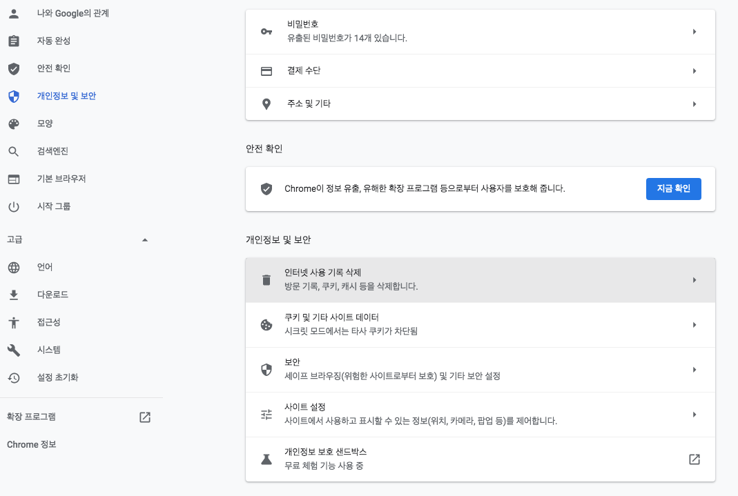 인터넷을 사용하다보면 찌꺼기 생기기 마련입니다. 그래서 정기적으로 한번 씩 청소를 하면 좋습니다. 설정에 가면 개인정보 및 보안에 인터넷 사용 기록 삭제가 있습니다.