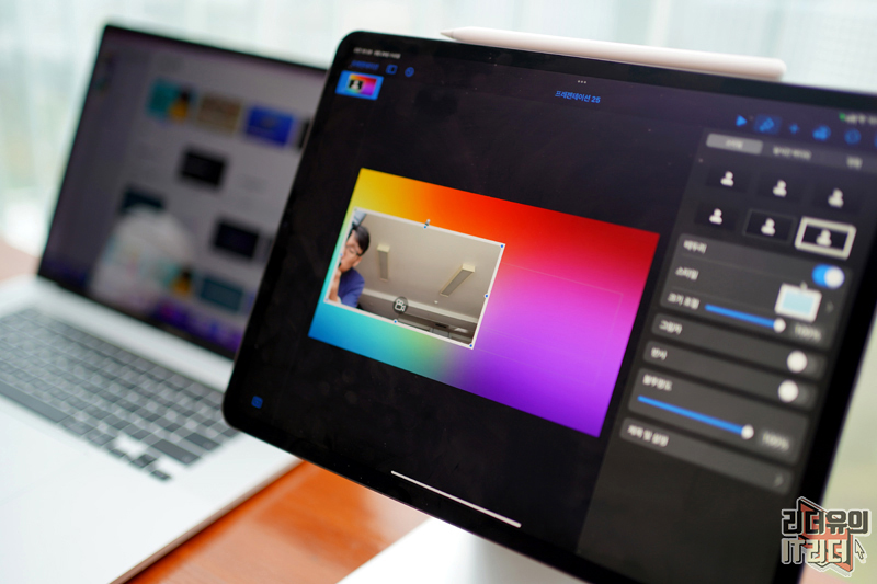 실시간 비디오를 넣으면 이렇게 키노트안에 카메라 화면이 나옵니다. 맥, 아이폰, 아이패드 카메라로 송출 및 다양한 카메라를 연결해서 사용도 가능합니다.