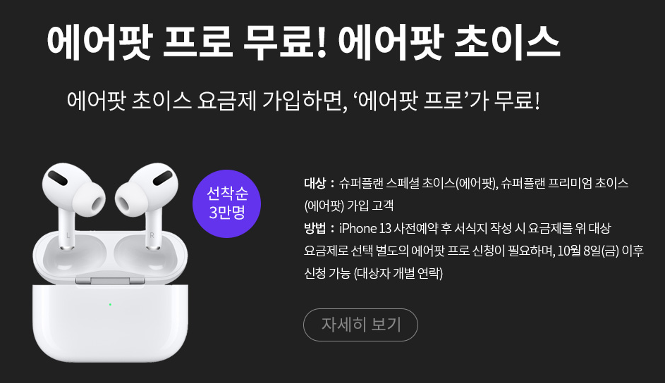KT도 고가의 요금제를 사용하면 에어팟 프로를 선착순 3만명에게 제공합니다. 통신사끼리 약속을 했나요? KT는 모두가 아닌 선착순이라는 점 참고해 두시기 바랍니다.