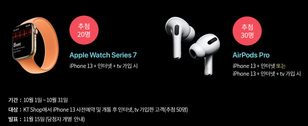 아이폰13과 함께 인터넷, TV를 가입하면 애플워치7, 에어팟 프로를 추첨으로 제공한다고 합니다. 아이폰13 사전예약 혜택이라 보기엔 무리가 있어 보입니다.