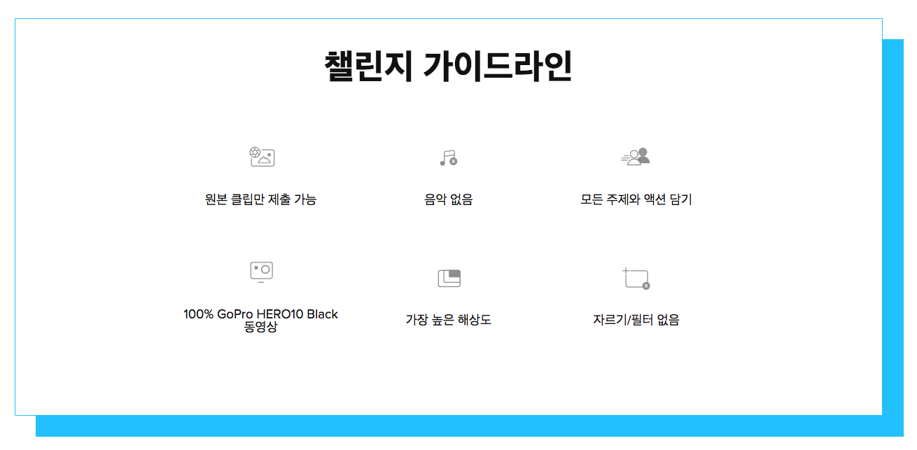 고프로 히어로10 블랙 밀리언 달러 챌린지 가이드라인을 보면 원본 클립만 제출 가능하고 음악 필요 없다고 합니다. 모든 주제와 액션이 가능하고 오직 고프로 히어로10 블랙으로 촬영한 영상만 대상입니다. 그리고 가장 높은 해상도와 자르기/필터 없이 하시면 됩니다.
