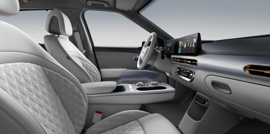 실내 디자인은 럭셔리 전기차의 확실한 차이를 보여주고 있습니다. 여백의 미를 강조한 수평적인 대시보드 라인을 볼 수 있고 아이오닉5 처럼 와이드한 디스플레이 두 개를 하나로 합친 인포테인먼트 시스템으로 세련된 디자인 매력을 느낄 수 있습니다. 12.3인치 클러스터 화면과 12.3인치 인포테인먼트 디스플레이로 첨단 이미지를 주고 있습니다. 그리고 친환경 소재, 플로팅 콘솔, 플랫 플로어 등으로 전기차만의 새로운 감성을 담았습니다.