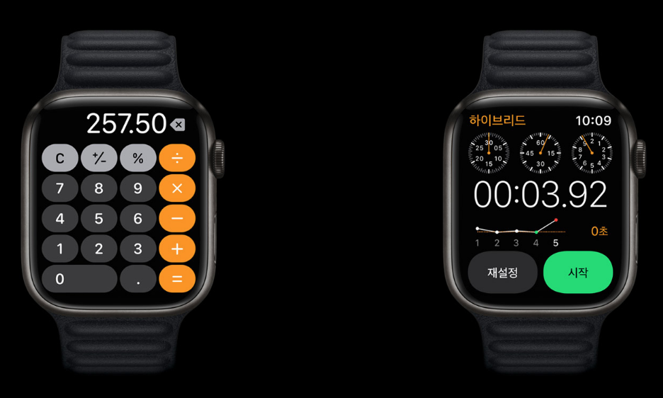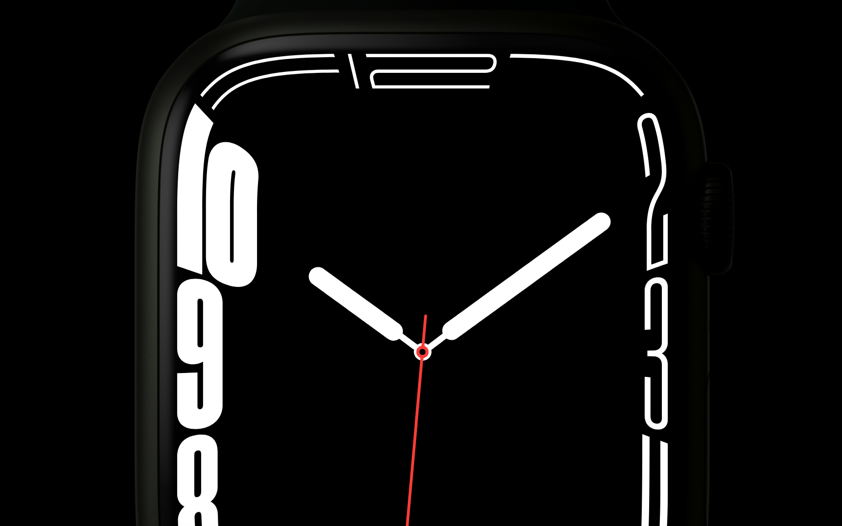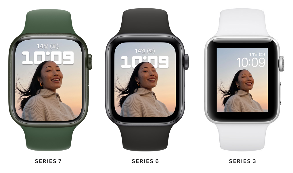 애플워치도 커진 화면에 맞게 변경이 되었습니다. 애플워치 시리즈7을 더욱 돋보이게 하는 두 가지 독특한 시계 페이스인 윤곽 페이스와 모듈 듀오 페이스를 제공해 애플워치 시리즈7만의 새로움을 더하고 있습니다.