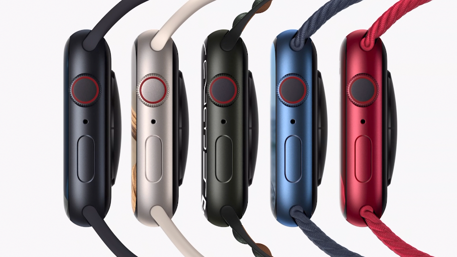 애플워치 시리즈7 색상은 알루미늄 케이스 마감 기준 미드나이트, 스타라이트, 그린, 새로운 블루, (PRODUCT)RED 다섯 가지 색상으로 구성되어 있습니다.