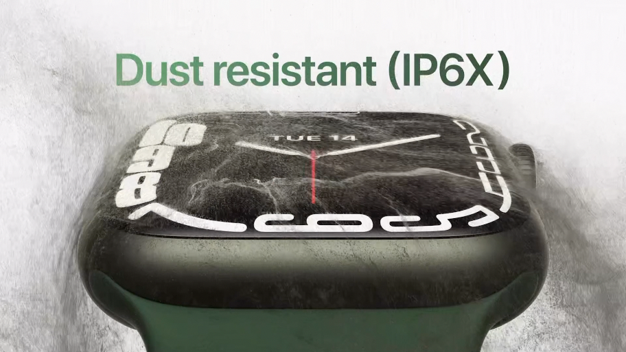 애플워치 시리즈7은 외부 충격으로 인한 균열을 더욱 효과적으로 방지하는 전면 크리스털을 탑재했습니다. 애플워치 제품 중 가장 견고한 내구성을 제공한다고 보시면 됩니다. 그리고 애플워치 최초로 IP6X 인증을 획득한 제품으로 방진 효과가 뛰어나면서 WR50 방수 등급을 유지하고 있습니다.