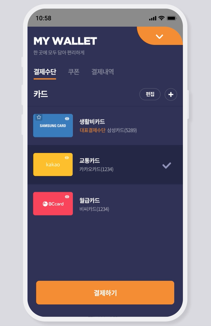 오프라인 카드들을 등록하고 애플페이 처럼 NFC 태그 방식으로 결제를 할 수 있는 서비스 입니다.