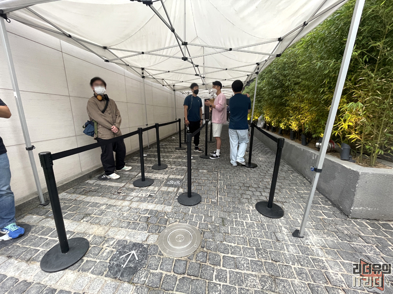 줄은 옆으로 설 수 있게 준비되어 있습니다. 뜨거운 태양이나 비를 피할 수 있게 천막이 쳐져 있습니다.