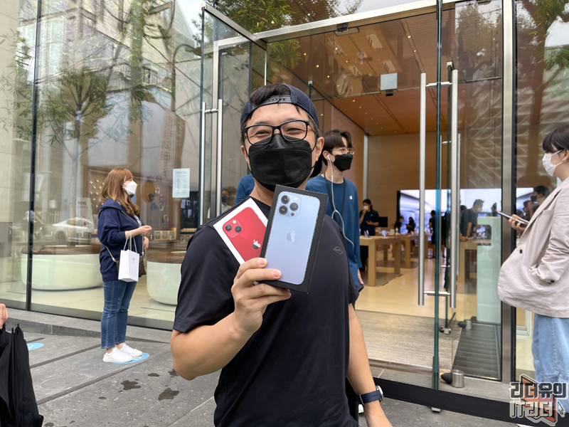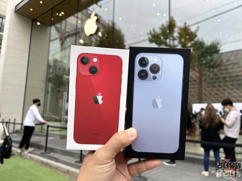 애플스토어 가로수길 아이폰13 1호 고객입니다. 구입한 모델은 아이폰13 프로 시에나 블루 색상과 아이폰 13 미니 (PRODUCT)레드 색상을 구입했습니다.