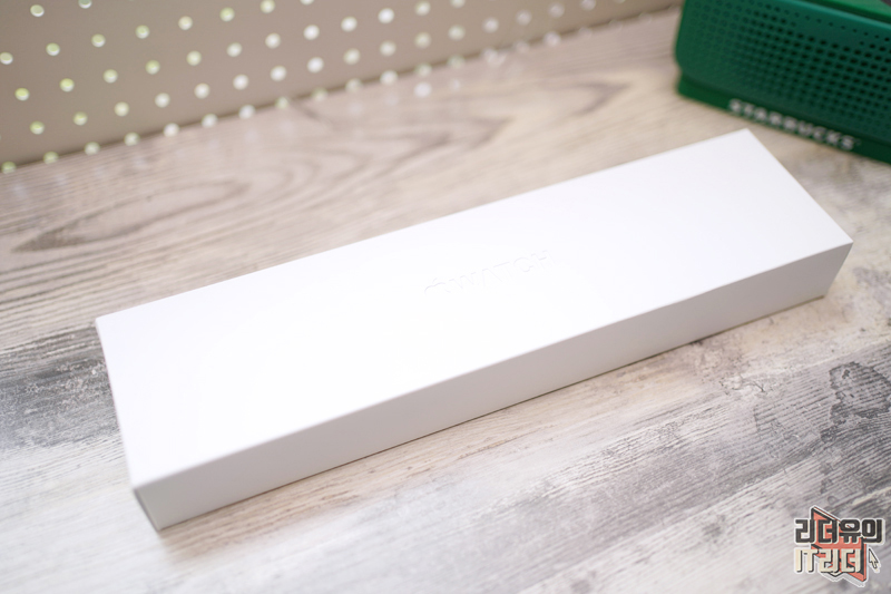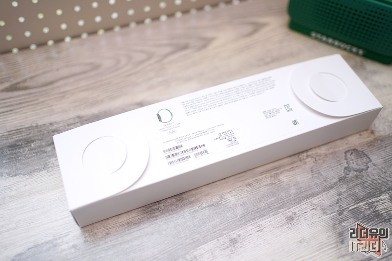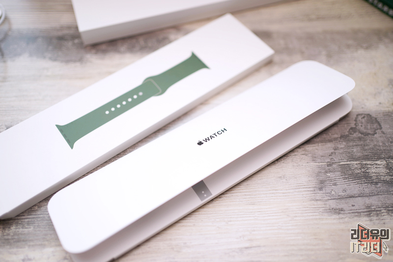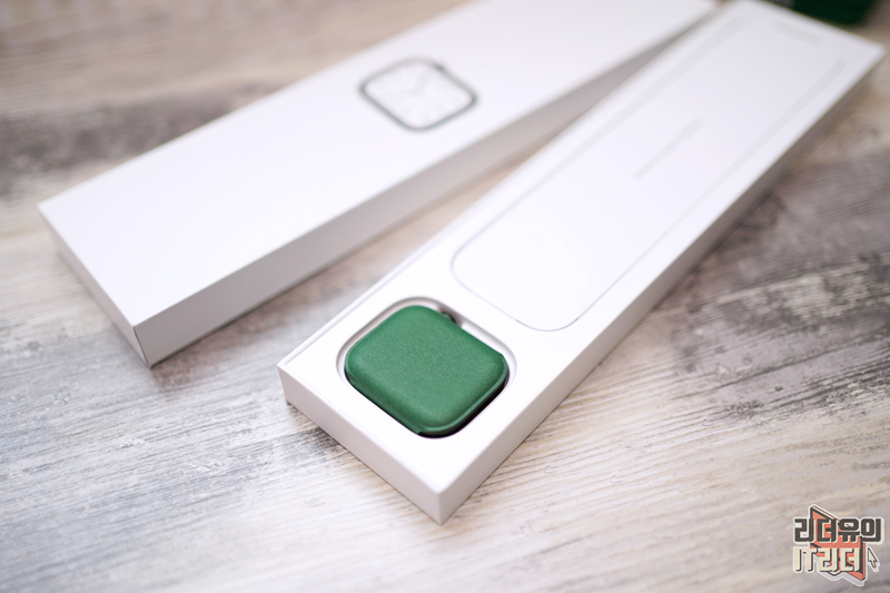 애플워치7 그린 패키지는 순백색의 화이트이고 음각으로 애플워치가 새겨져 있습니다. 애플은 다른 제품들은 색상별로 패키지에 포인트를 주는데요. 애플워치는 모델별로 패키지 차이를 주고 있고 색상에서는 차이를 주지 않습니다.