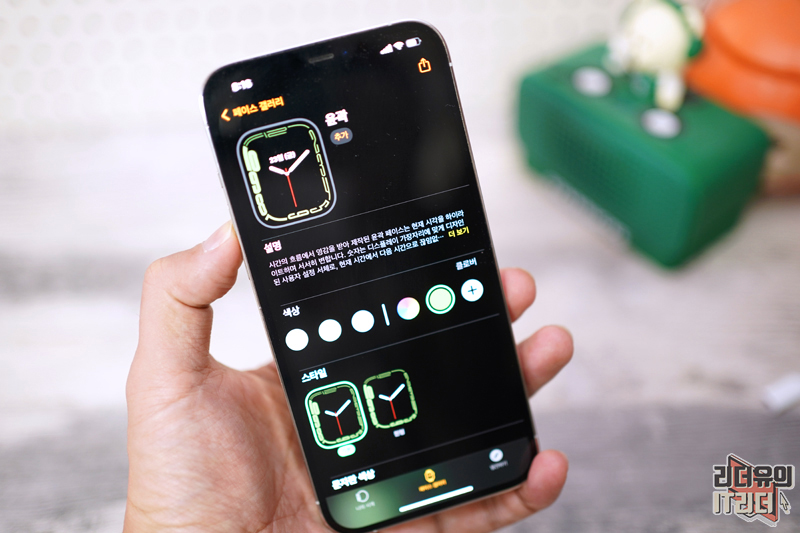 이번에 애플워치7에만 적용된 윤곽 시계 페이스 입니다. 애플워치7 그린이라고 이 시계 페이스도 그린이 메인 컬러로 매칭되어 있습니다.