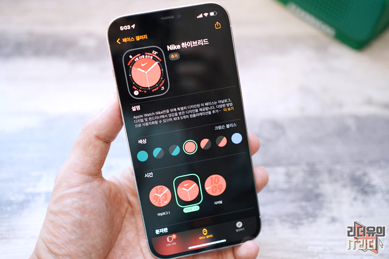 나이키 하이브리드 워치페이스를 적용한 모습입니다. 아날로그, 디지털 및 윈드러너에서 영감을 받은 디자인을 제공하는데요. 최대 5개의 컴플리케이션을 등록해 사용할 수 있습니다.