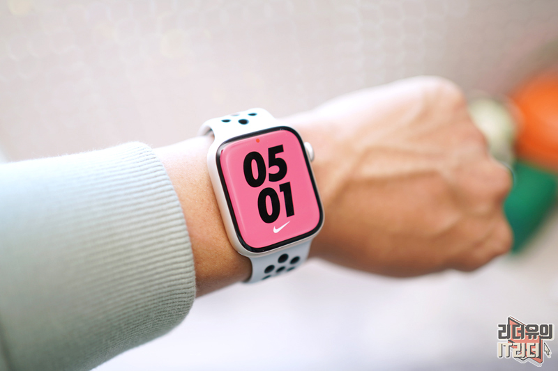 애플워치7 나이키 에디션 스타라이트를 착용한 모습입니다. 이번에 새롭게 추가된 나이키 바운스 워치페이스가 적용되어 있습니다. 건드리면 시계가 반응하는 재미있는 워치페이스 입니다.