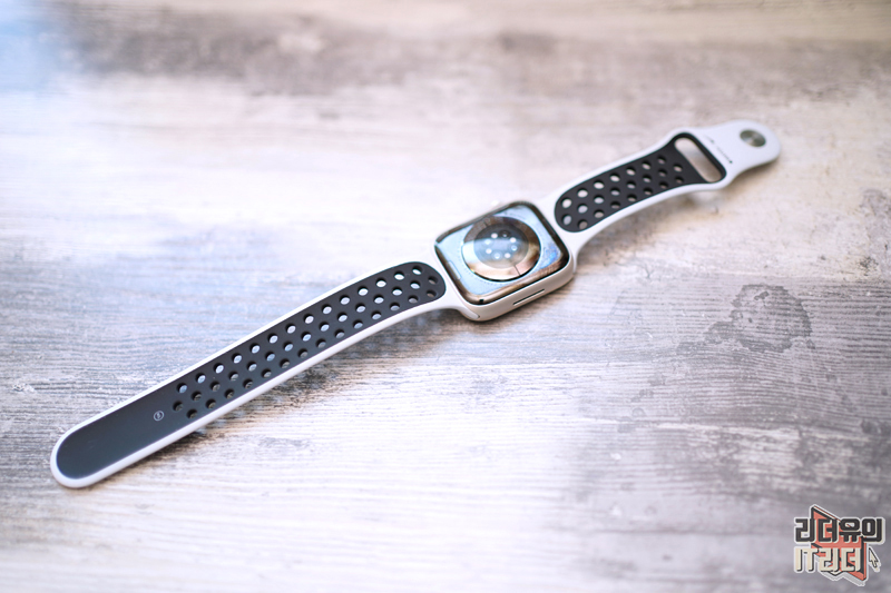 나이키 스포츠밴드 안쪽에는 블랙 영역이 많이 들어가 있습니다. 앞뒤 개성있는 디자인으로 애플워치7 나이키 에디션만의 개성을 뽐내고 있습니다.