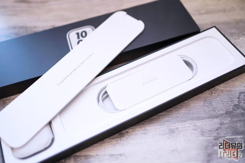패키지 오픈은 아래쪽에 양쪽에 잡아주는 부분을 열어서 오픈이 가능합니다. 여기에는 따로 씰이 있지 않고 비닐 포장도 되어 있지 않습니다. 참고로 애플은 환경을 위해 비닐포장을 없앴습니다.