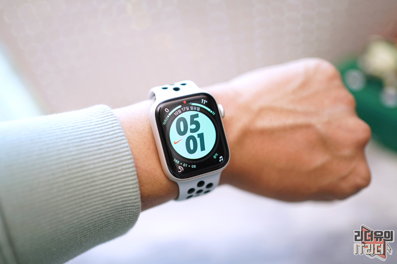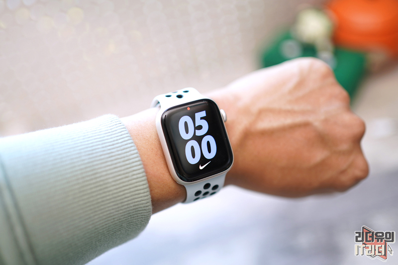 애플워치7 나이키 에디션 스타라이트를 착용한 모습입니다. 이번에 새롭게 추가된 나이키 바운스 워치페이스가 적용되어 있습니다. 건드리면 시계가 반응하는 재미있는 워치페이스 입니다.