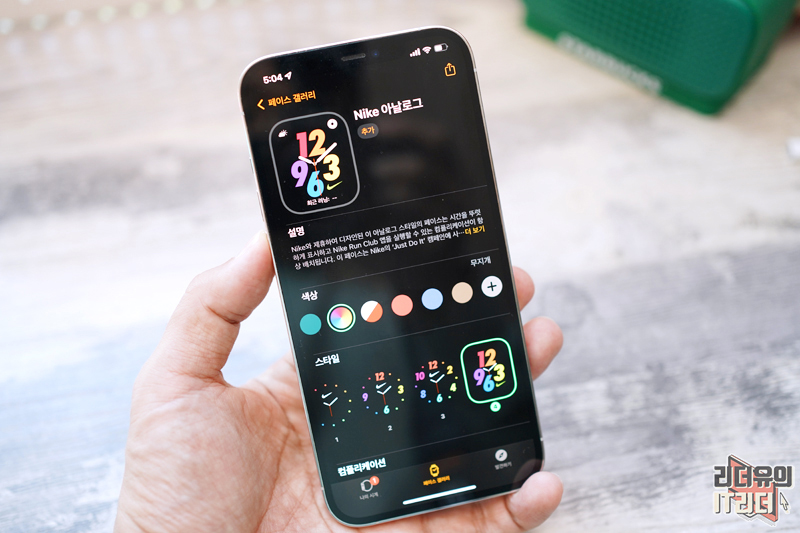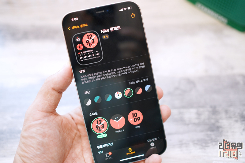 나이키 하이브리드 워치페이스를 적용한 모습입니다. 아날로그, 디지털 및 윈드러너에서 영감을 받은 디자인을 제공하는데요. 최대 5개의 컴플리케이션을 등록해 사용할 수 있습니다.