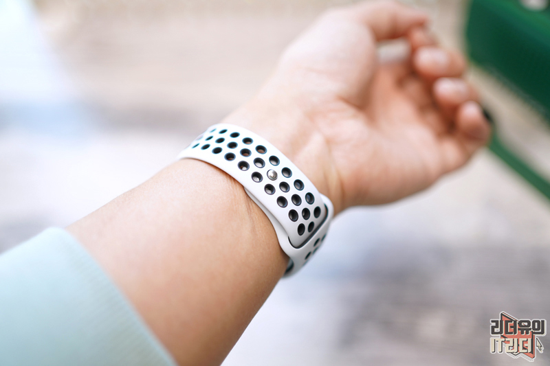 나이키 스포츠 밴드를 착용한 모습입니다. 구멍이 많아서 환공포 느껴지는 분들 있죠