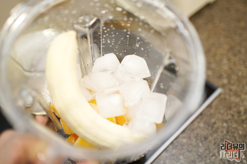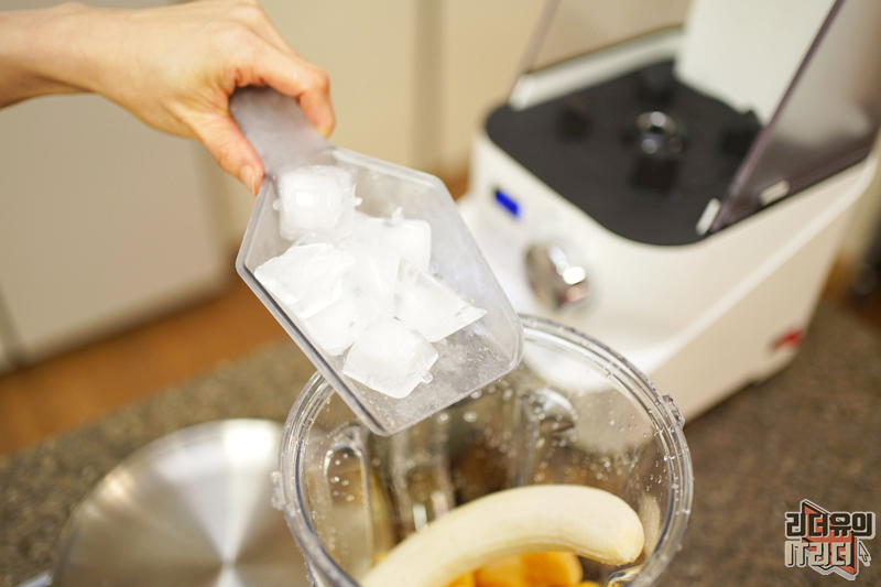 스무디를 만들때는 이렇게 얼음도 같이 투입합니다. 어려울게 없죠. 빙수도 만들 수 있고 냉면 먹을 때 얼음 육수도 쉽게 만들 수 있습니다. 참고로 얼음을 갈 때는 적당량의 물을 같이 넣어주시면 더욱 쉽게 갈 수 있습니다.